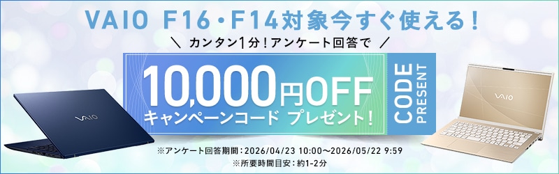 アンケートにお答えいただくと、VAIOストアでVAIO F16・F14購入時に使える 10,000円引きのキャンペーンコードをプレゼントします。 ※ご注文確定後のキャンペーン適用はお受けしておりません。 キャンペーン適用をご希望の場合は、必ずご注文前に本アンケートへのご回答をお願いします。