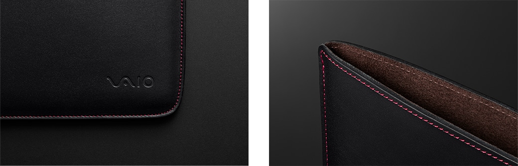 イタリアンレザーを使用した、VAIO® SX14-R専用のPCケースです。表地は革の風合いやエイジングを楽しめる植物タンニンなめし革を、裏地にはダークブラウンのスウェード調生地をあしらい、ステッチには「ファインレッド」に合わせた赤色を用いています。VAIO® SX14-Rの上質な雰囲気に調和するよう一つ一つ丁寧に仕上げました。
