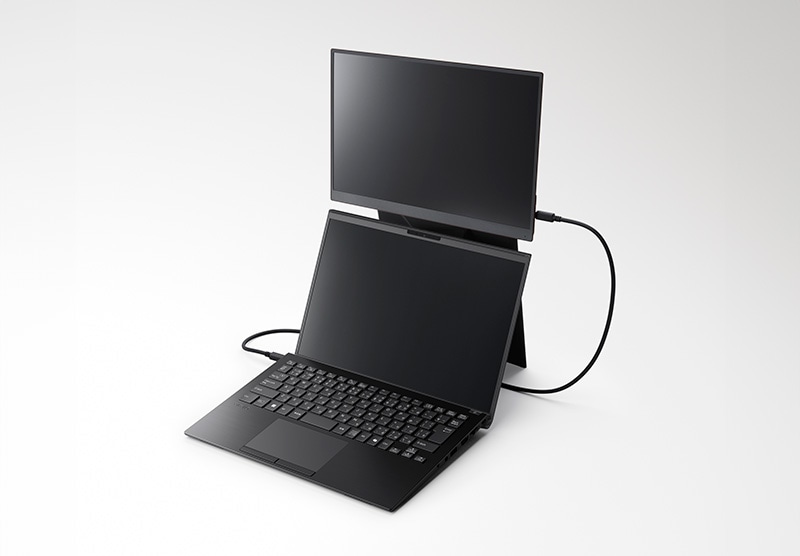 USB Type-C®ケーブル1本で接続できる14.0型ワイドサイズのモバイルディスプレイ VAIO Vision+® 14*との組み合わせもおすすめです。VAIO® SX14-Rと同じ液晶サイズで、一般的な左右に画面はもちろん、狭いデスクでも使えて視線移動もしやすい上下二画面にも対応。利用シーンや作業内容に応じた最適なスタイルで利用できます。